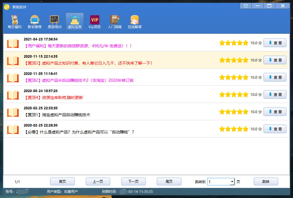 以上就是软件的大体情况,我简单概括下,每日福利、新手推荐和虚拟宝库,是可以直接变现的三大项目,原创培训和vip项目属于技能提升,适合想靠网络吃饭的人,通过网络副业改变只能拿死工资养家糊口的困境。